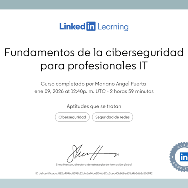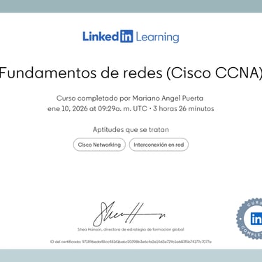 • Prep. Certificación Cisco CCNA (200-301) (LinkedIn Learning): Prep. Cert.: Introducción | Fundamentos de redes | Acceso a redes | Conectividad IP | Servicios IP | Fundamentos de seguridad en red | Automatización y programación de redes.