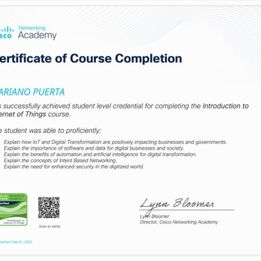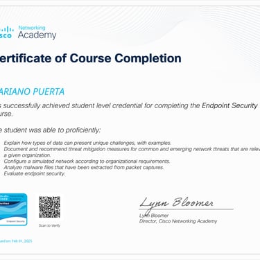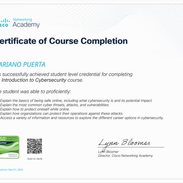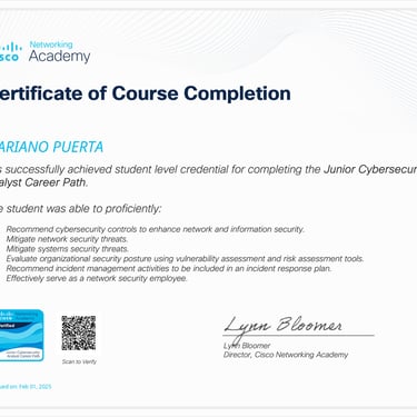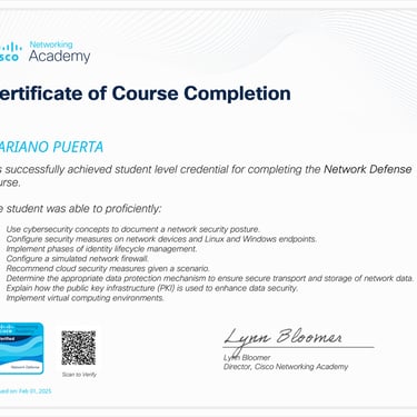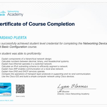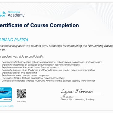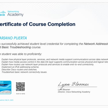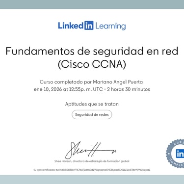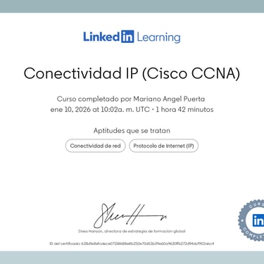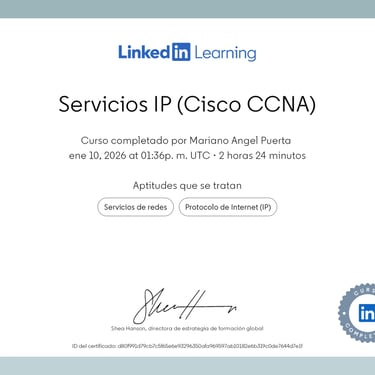 • Programa especializado: Cisco CCNA 200-301 (Packt - Coursera): Networking Basics and Cisco IOS Essentials | Switching, VLANs & Routing | WAN, Security, and Network Services | Network Automation, Cloud, and Emerging Technologies.