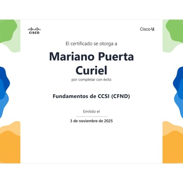 Junior Cybersecurity Analyst, Ethical Hacker, Network Technician, IoT y Transformación Digital, Network Defense, Endpoint Security, Network Addressing, Networking Devices, Cyber Threat Managemet (Cisco & Universidad Miguel Hernández).