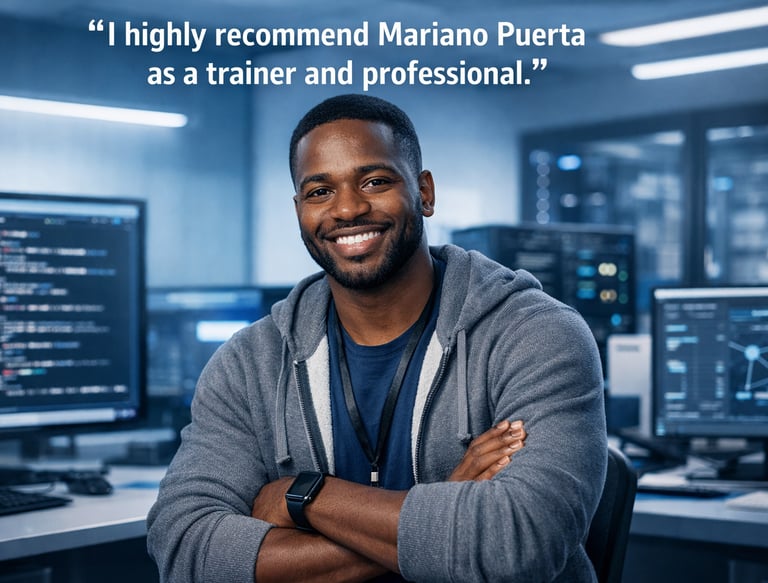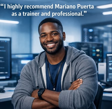 Asistí al curso de Ciberseguridad (50 horas) impartido por Mariano Puerta en Malabo y fue una experiencia realmente valiosa. Explica con claridad, hace sencilla la parte técnica y siempre conecta los contenidos con situaciones reales de trabajo.